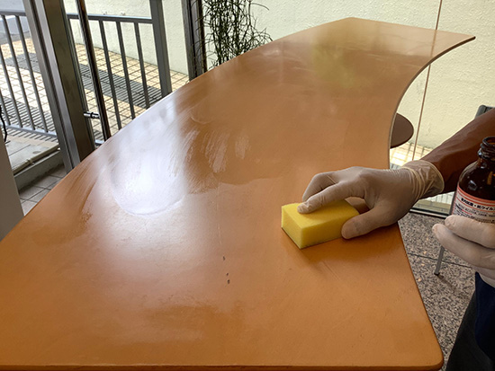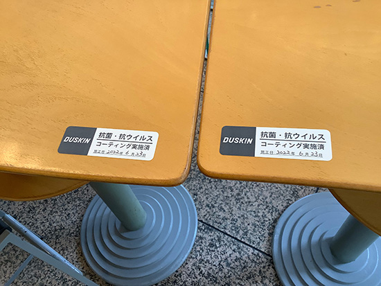 今回は1階レストランホールのテーブルを再施工の更新をいたしました。2年の耐久期間前に適切なメンテナンスを継続することがダスキンを契約する理由です。