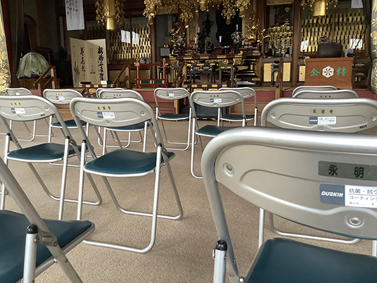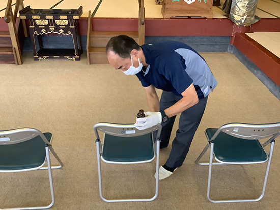 蓮のお花が良くお似合いの由緒あるたたずまいの寺院です。 本堂のパイプ椅子のお掃除と抗菌抗ウィルス処理を定期的に施工しています。 本堂に訪れる多くの方がご高齢の方が多くどうしても不安が発生してしまいます。その払拭にこのサービスを半年ごとの定期サービスで利用しています。その都度安心をしていただき、廊下の手すりや、おトイレのドアノブなど手で触る所はほとんど処理しています。 この御時世であってもお寺を訪れる方は来てよかったと思っていただけるように心がけています。